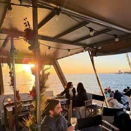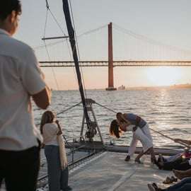 Wyrusz na rejs katamaranem o zachodzie słońca po rzece Tag. Wypij drinka na pokładzie, zrelaksuj się na siatkach i przepłyń obok słynnych miejsc, takich jak Wieża Belém i Most 25 Kwietnia.