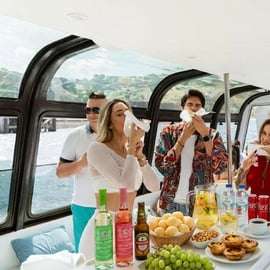 Ciesz się tętniącym życiem, a zarazem eleganckim rejsem na pokładzie naszej luksusowej i niezwykle komfortowej łodzi, zaprojektowanej z myślą o relaksie, spotkaniach towarzyskich i niezapomnianych widokach. To wyjątkowe doświadczenie obejmuje otwarty bar z nieograniczoną ilością białego i różowego wina Vinho Verde Casal Garcia, białą sangrią, porto z tonikiem, portugalskim piwem, napojami bezalkoholowymi, wodą mineralną i kawą. Do tego bufet z portugalskimi przysmakami, takimi jak pão de queijo, prażone orzechy ziemne, świeże winogrona i słynny pastel de nata. Wszystko to w żywej i przyjaznej atmosferze na pokładzie.